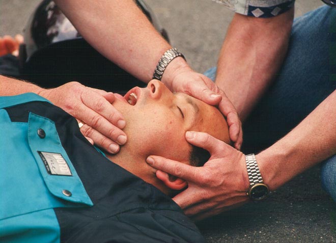 Der zweite Helfer entfernt ggf. die Brille des Bewusstlosen und macht den Mundbereich (Kinnschale, Kopfhaube) frei.